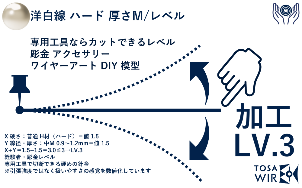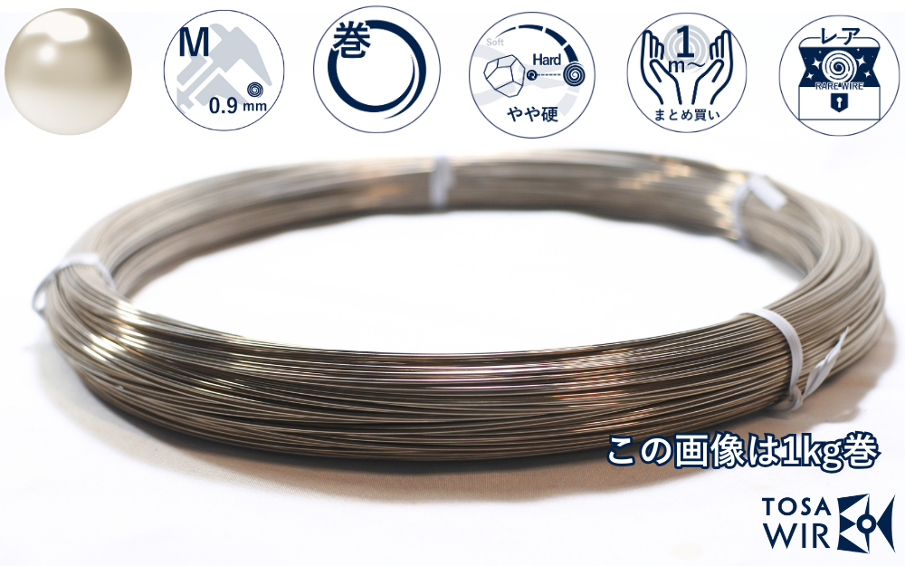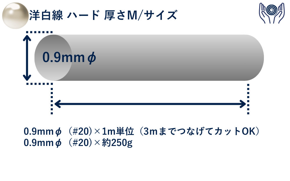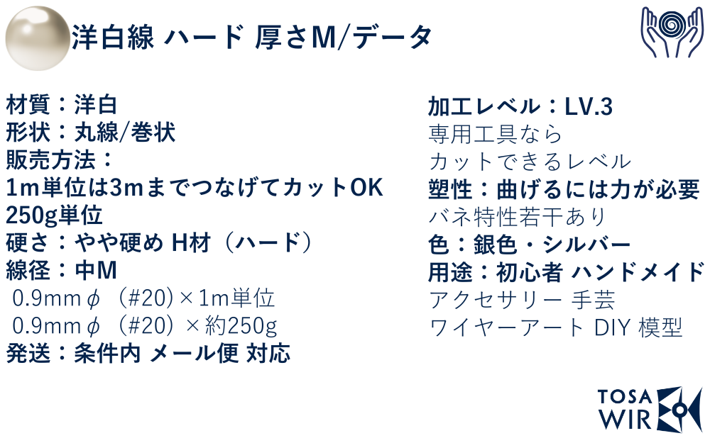 洋白線 硬質 中Mは、専門的なアクセサリー製作や装飾工芸に適した0.9mmφの汎用ワイヤーです。洋白特有の上品な銀色を備え、適度な硬度と弾性を兼ね備えています。専用工具での加工が可能で、複雑な造形や細部の表現に対応。プロフェッショナルな仕上がりを求める制作者向けの信頼性の高い素材です。