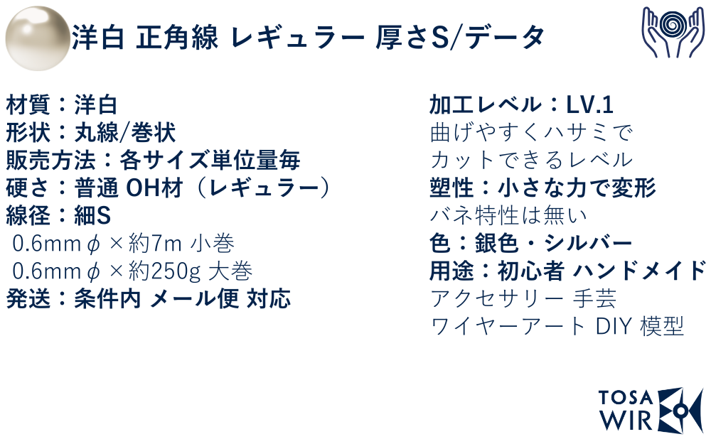 洋白線 ハード 細S(0.6mmφ)は、加工性を重視した汎用ワイヤーで、軽い力での曲げ加工とハサミでのカットが可能です。洋白素材の上品なシルバー色を備え、ハンドメイドアクセサリー、ワイヤーアート、プラモデル製作に適しています。バネ特性を持たない塑性特性により、複雑な形状表現が容易で、初心者から経験者まで対応。7m・250g巻で販売、メール便対応により、小ロットから本格的な製作まで柔軟に対応できます。