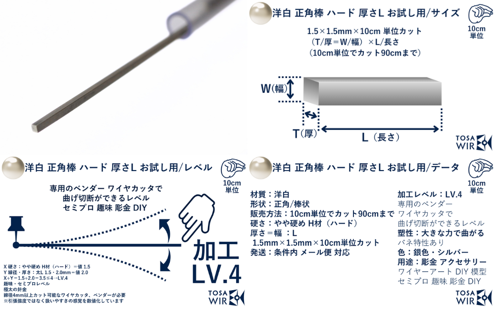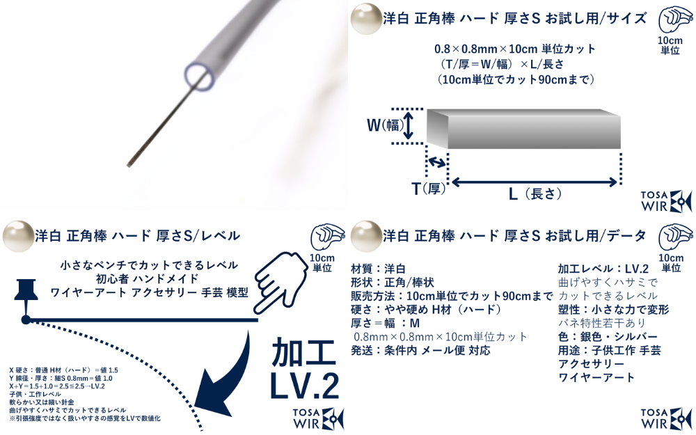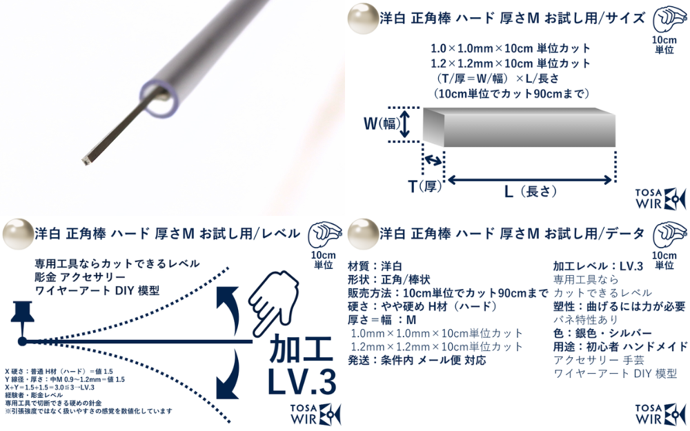洋白正角線やや硬質のお試しセット。S(0.8mm角)は、小型ペンチで容易にカット可能で、初心者向けハンドクラフトやワイヤーアート制作に適した扱いやすさを備えています。M(1.0・1.2mm角)L(1.5mm角)は、専用工具でのカットを想定し、彫金やアクセサリー制作、より複雑なワイヤーワークに対応する剛性を提供します。両規格とも磨き済み仕上げで即座に使用可能。10cm単位のカット販売により、プロジェクト規模に応じた効率的な材料調達が実現できます。